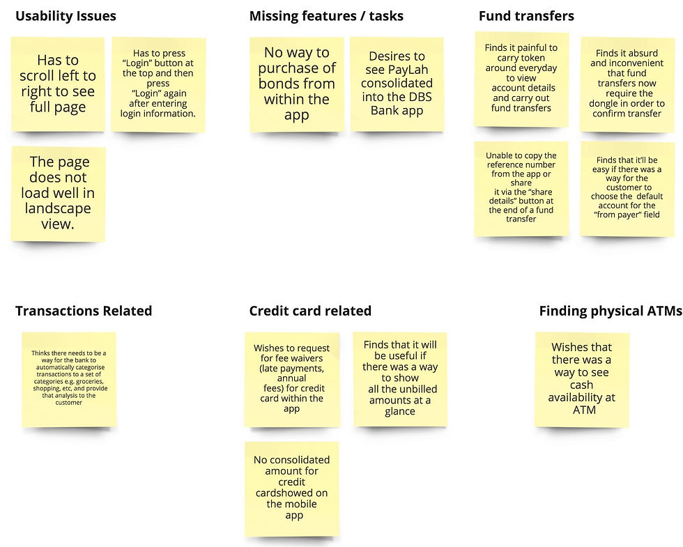 We understood that users do express their opinions online and on social media, therefore we looked into that area and started to collect as much information as we can. We managed to collect data from various public sources such as specific articles posted by DBS on their Facebook page, tweets, as well as app store reviews from Apple Store and Google Playstore. All these feedback collected were then analysed and referenced.